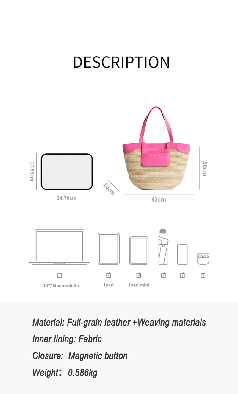 Woven large capacity tote bag with French top layer cowhide and grass woven handbag